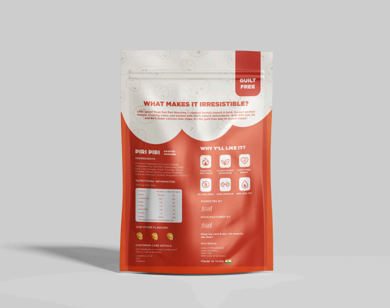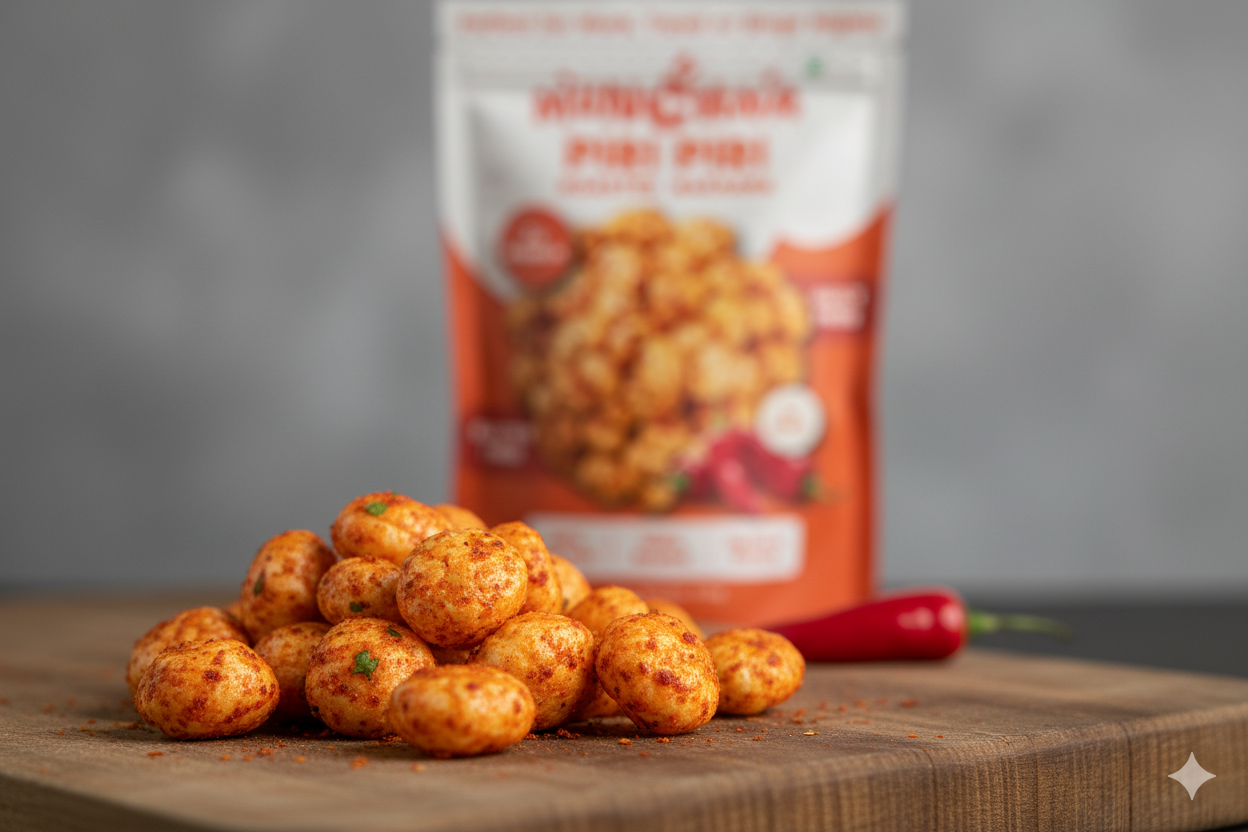 Ingredients: Roasted lotus seeds (makhana), sunflower oil, peri-peri spice blend (chili, paprika, garlic), Himalayan pink salt.